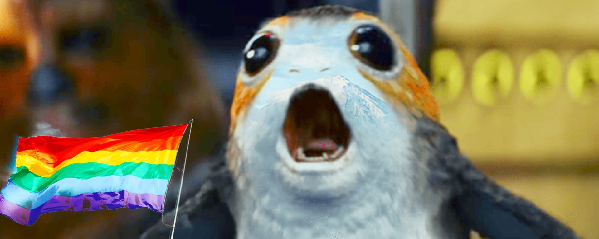 This brings us back to The Last Jedi and the so-called LGBTQIA moment I’ve been alluding to for this whole post. It’s truly a “blink and you’ll miss it” moment. During one of the many establishing shots we get of Ahch-To, there is a brief shot of the porgs just being porgs like the weird bird hamsters they are. As two porgs chirp like the dickens, a third flies into frame. He hobbles over to the background porg and begins to gently nestle his face into the fellow porg’s breast. Doublecheck the eyes. Both male!